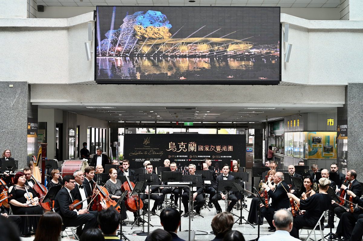 歷經長途跋涉,被譽為東歐首屈一指的交響樂團「烏克蘭國家交響樂團」,首次來臺展開巡迴演出,全團今(11)日在高雄市政府四維行政中心中庭的記者會上,演奏《烏克蘭國歌》及臺灣民謠《望春風》兩首曲目,磅礡、悠揚的樂音感動現場觀眾。高雄市長陳其邁在會中表示,該團在最艱難時刻來到臺灣,展現民族國家的韌性,他要代表市民向烏克蘭人民表達敬意。