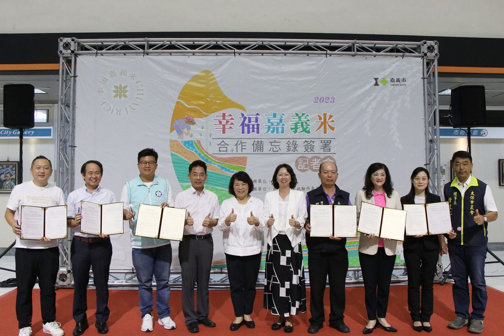 嘉義市政府為支持在地農業發展,推廣在地優質米糧,維護環境永續發展,於今(11)日在市府中庭舉行「幸福嘉義米合作備忘錄簽署記者會」,嘉義市長黃敏惠與嘉義市農會、嘉義縣太保市農會、三光米股份有限公司嘉義分公司、嘉義市私立興華高級中學及奮起福米餅店共同簽署幸福嘉義米合作備忘錄,產、官、學、研共同宣傳行銷幸福嘉義米,一起讓好米推廣發揚到全世界。