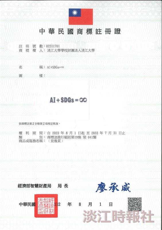 「AI+SDGs=∞」自2023年8月1日起,正式通過經濟部智慧財產局認證,成為專屬淡江大學註冊商標!校長葛煥昭表示,淡江大學2021年正式以「AI+SDGs=∞」為校務發展願景,兩年來在同仁的努力推動下,慢慢融入教學、行政各面向,並展現不少優異成果,希望大家持續努力,幫助淡江「超越現在,共創未來」。