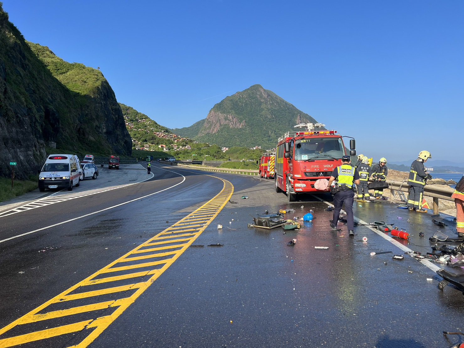 新北市消防局上午七時許獲報,一輛聯結車翻覆在台2線79.5k靠海一側約3米深的消波塊旁,消防局立即出動瑞芳中隊、瑞芳、九份、秀峰分隊等,9車22人馳援,消防人員抵達現場,在路邊並沒有看到駕駛,聯結車冒白煙,車頭嚴重變形,腐蝕性的液態氯化鈣洩漏一地 ,李姓駕駛(46歲)受困車內,已無呼吸、心跳,消防人員架梯破壞車體,將駕駛送往瑞芳礦工醫院急救後宣告不治, 事故原因正由警方調查中。