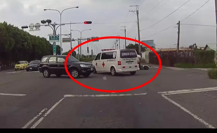 事故造成闖紅燈機車上兩名騎士摔落在地。一輛正好行經現場的民間救護車見狀立即停車,救護人員迅速下車查看傷者狀況,展現專業應變能力。