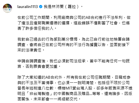 我對自己過去的行為感到萬分懊悔,為此已自行前往地檢署自請調查,會將自己在前公司所有的不法行為據實以告,並面對接下來的法律責任。
