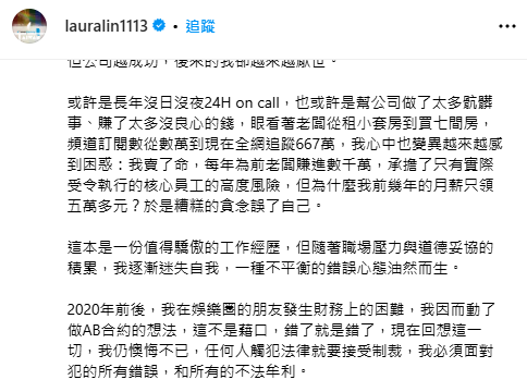 2020年前後,我在娛樂圈的朋友發生財務上的困難,我因而動了做AB合約的想法,這不是藉口,錯了就是錯了,現在回想這一切,我仍懊悔不已,任何人觸犯法律就要接受制裁,我必須面對犯的所有錯誤,和所有的不法牟利。