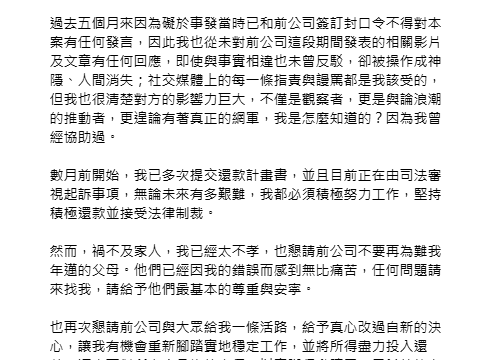 也再次懇請前公司與大眾給我一條活路,給予真心改過自新的決心,讓我有機會重新腳踏實地穩定工作,並將所得盡力投入還款,逐步面對所有應承擔的責任。以實際行動贖罪,只希望能在最低限度的安寧中重新站起來,盡己所能彌補過去的過錯。