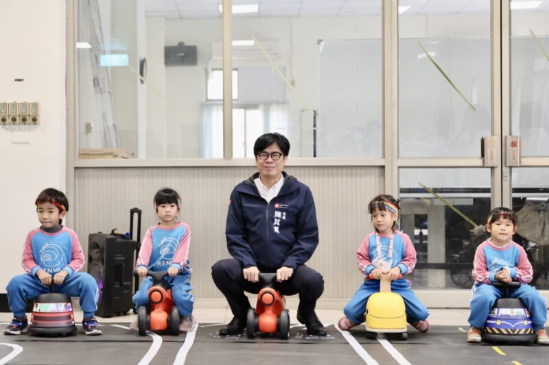 圖/陳其邁逐一參觀公托空間,與幼兒玩樂互動,並參加三輪車競賽,現場笑聲不斷、氣氛歡樂。