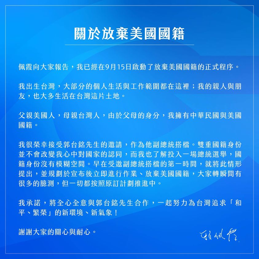 郭台銘14日宣布副手人選為資深藝人賴佩霞,但賴佩霞卻擁有美國、中華民國雙重國籍,引發各界關注與討論。針對此事,賴佩霞今天(16日)宣布,已經在15日啟動放棄美國國籍的正式程序。