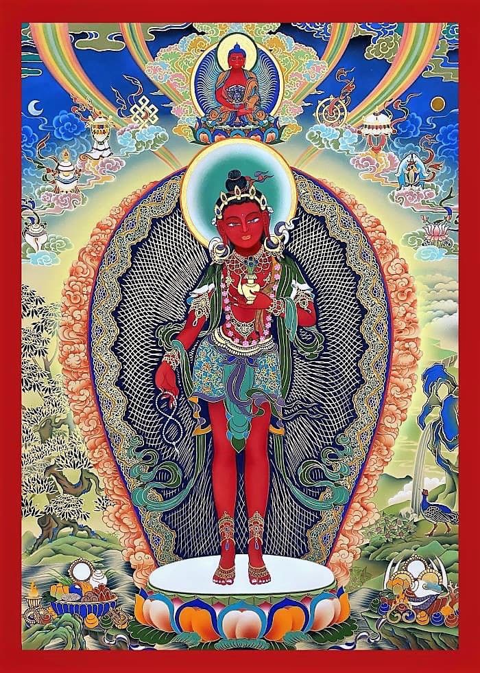 紅觀音,2021年,謝克駿繪。礦彩質感唐卡莊嚴鮮麗。圖 / 謝克駿提供