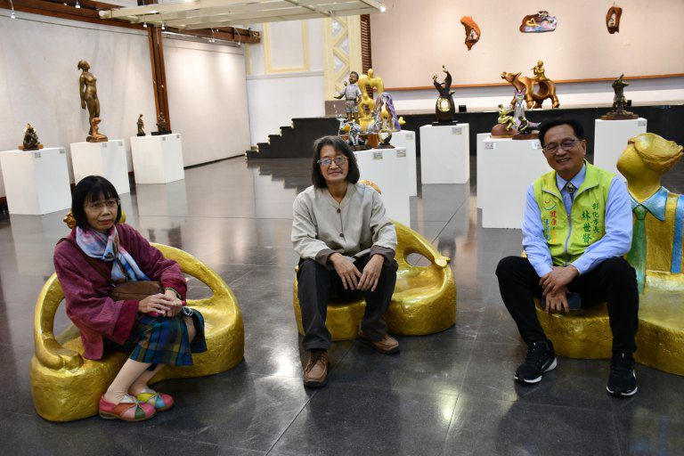▲彰化市公所自3日至22日在彰化藝術館舉辦114年首展-「昭旺.玟瑾〝愛在起飛〞雕塑創作展」,王昭旺、何玟瑾伉儷與市長林世賢歡迎市民與親朋好友前來,一同來享受這場溫馨快樂的饗宴。(圖╱記者孔亮云攝)