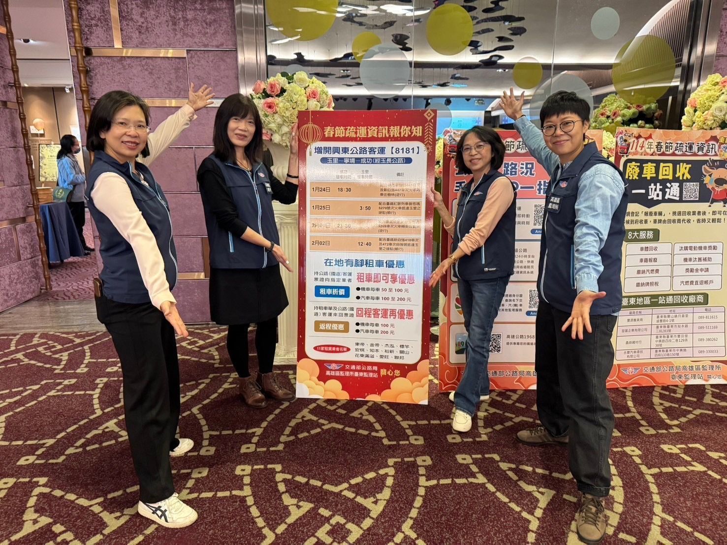 另外,為貼心守護返鄉過節夜歸的旅客,臺東監理站特別協調興東客運公司「【8181】玉里-寧埔-成功(經玉長公路)」路線,配合臺鐵疏運暨臺東縣政府新春返鄉專車需求,於1月24、25日(節前)及2月1、2日(節後)共加開4班車,讓遊子返鄉轉乘更安心。成功往玉里班次: 114年1月24日增開18時30分,配合抵達「玉里」火車站之臺鐵新自強445次及新自強447次(北上)對號車轉乘。114年2月1日增開23時30分,配合抵達「玉里」火車站之臺鐵紅眼列車普悠瑪5269車次(北上)對號車轉乘。玉里往成功班次:114年1月25日增開3時50分(玉里往成功)班次,配合抵達「玉里」火車站之臺鐵紅眼列車普悠瑪5270車次(南下)對號車接駁。114年2月2日增開12時40分,配合抵達「玉里」火車站之臺鐵新自強號410車次、472車次(南下)對號車接駁。