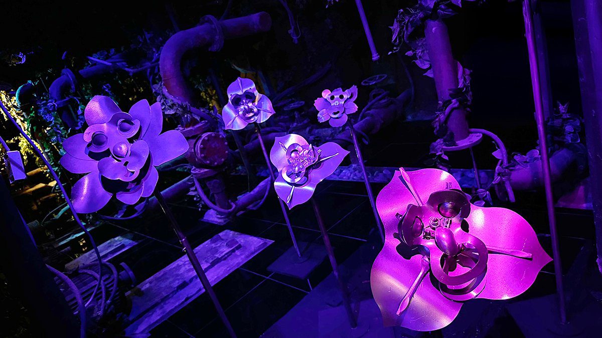 展覽以多層次影像投影、互動式光影效果及聲音設計,營造出如夢似幻的感官旅程。從象徵生命的「生命之樹」到充滿未來寓意的「鐵掌花」和「猴面花」,每一個設計元素都精緻細膩,串聯過去與未來的時空結界。「時空魔花」不僅彰顯了十鼓團隊的創意極限,更重新定義了工業遺產的價值,讓傳統文化在現代藝術中煥發新的光芒。