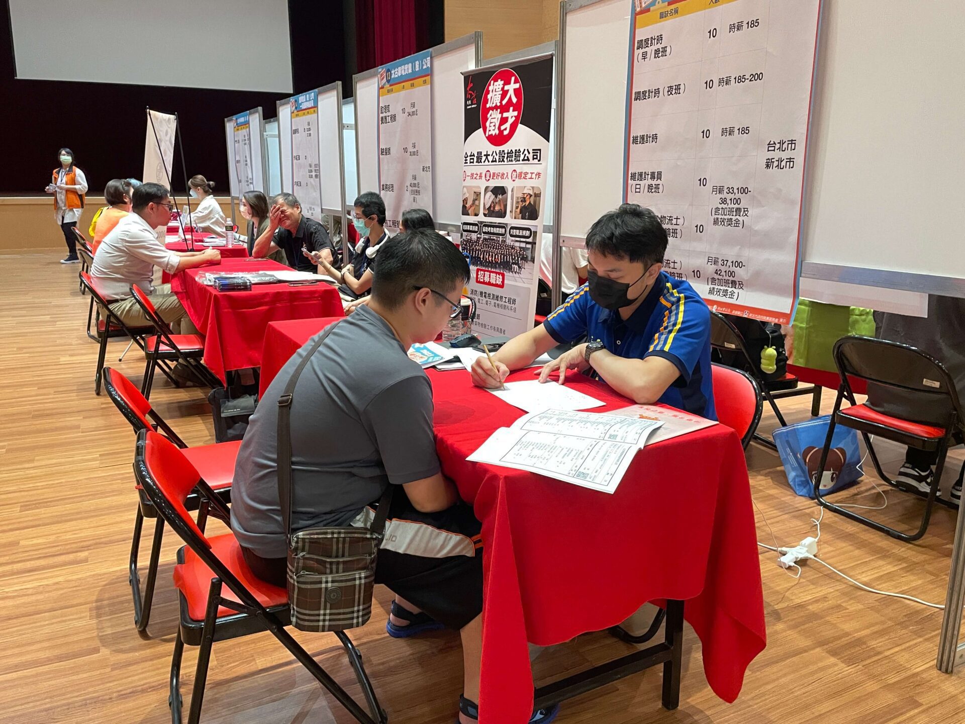 9月22日在淡水水碓市民活動中心3樓大禮堂,計有美廉社、統一超商、豆府、典華幸福機構及將捷文創實業等10家廠商參與,提供超過450個工作機會,其中將捷文創實業的餐飲部副領班、台灣順豐速運的貨車收派員,皆開出40K薪資,相當吸引人。