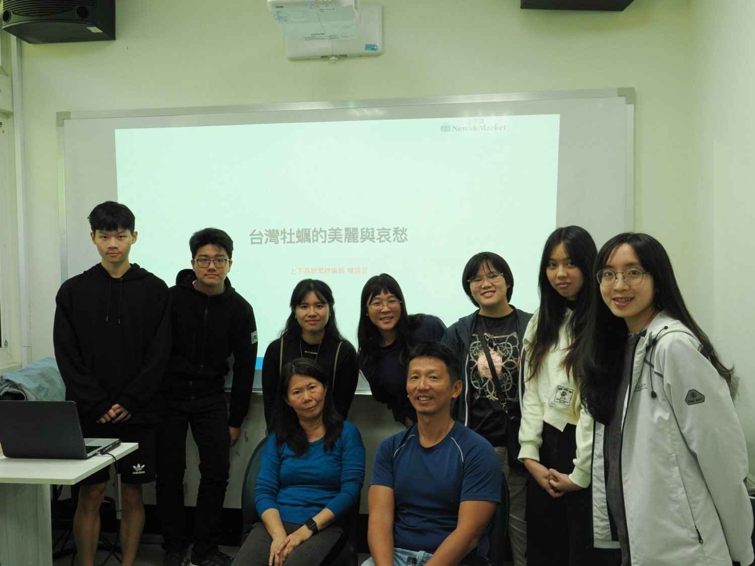 上下游總編楊語芸主講「臺灣牡蠣的美麗與哀愁」,分享自身採訪經歷與走訪蚵業時的所見所聞,深入險地揭發中國的走私牡蠣如何變成馬祖生蠔內銷臺灣、中國牡蠣如何頂替越南蚵仔進口臺灣;並介紹了臺灣不同地區的牡蠣養殖方法,如海岸地區普遍運用插篊式、垂吊或平掛等方式,將蚵架架設在海岸,牡蠣每天只在漲潮時沉入海水中進食,退潮後則掛在太陽下接受風吹日曬雨淋,生長較為緩慢;另浮筏式養殖則是讓蚵架長期浮在海上,蚵串就一直浸泡在海裡,24小時都在海水進食,因此成長較快;越南蚵仔養殖業也是利用浮筏式,年輕漁民在政府劃定的特定養殖區,從蚵苗到包裝加工的系統化作業流程。她從臺灣養蚵業者種苗、養殖、挑蚵、包裝、出貨到回收的每一個環節,總結、歸納了臺灣牡蠣產業的困境、挑戰,並試圖提出解方,讓與會學生激盪思考。