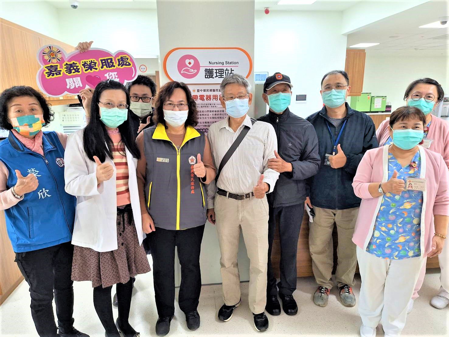 〔焦點時報/記者李芷妍報導〕嘉義榮服處副處長曾秀琴1/9日上午偕同榮欣志工及替代役男前往臺中榮民總醫院嘉義分院與陸軍官校校友會同袍會合,並在嘉義分院社工室主任陳麗圓陪同下,共同探視關懷住院榮民,並致送營養補充品,向住院榮民表達關懷之意。