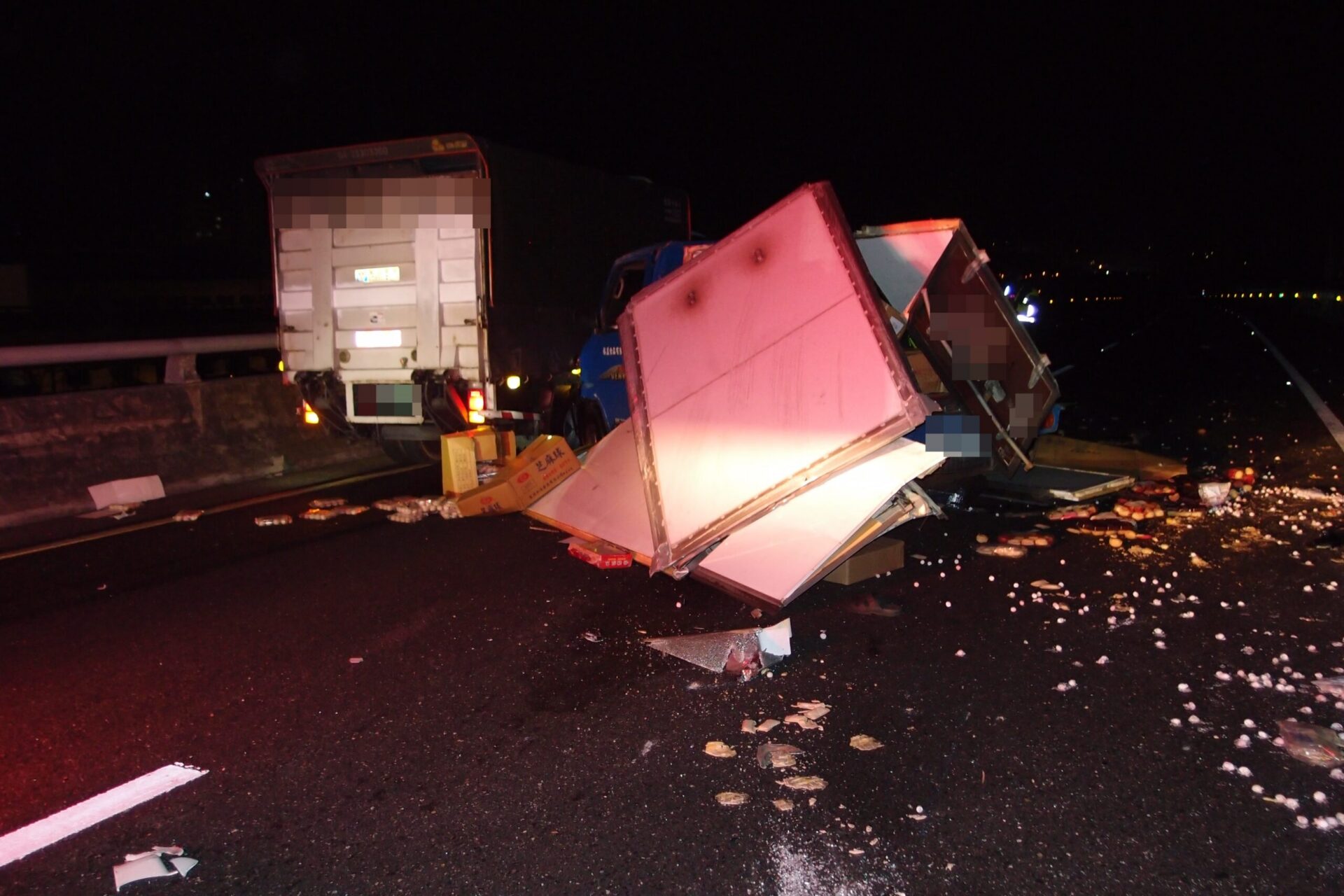 今(10)日凌晨3時53分許,一名48歲陳姓男子駕駛小貨車行經國道1號五楊高架道南向67.3公里幼獅路段,疑似因恍神精神不濟撞擊61歲邱姓女子駕駛的小貨車,陳男車輛車頭嚴重損毀,遭撞的小貨車後車斗則是被撞開,貨物散落一地,國道警察獲報趕緊到場處理。該起事故造成陳男、邱女受傷,所幸均意識清楚,送往楊梅天成醫院救治後已無大礙。