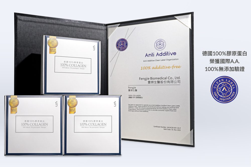 以純淨與高效為核心,豐傑生醫的「德國100%膠原蛋白」在國際市場中再次獲得權威認可,成功通過A.A.Clean Label無添加發展促進會的嚴格稽核驗證,取得最高等級A.A.100%無添加驗證。這項驗證意味著該產品完全不含人工香精、色素、防腐劑等797項食品添加物,是2025年最值得購買的膠原蛋白!