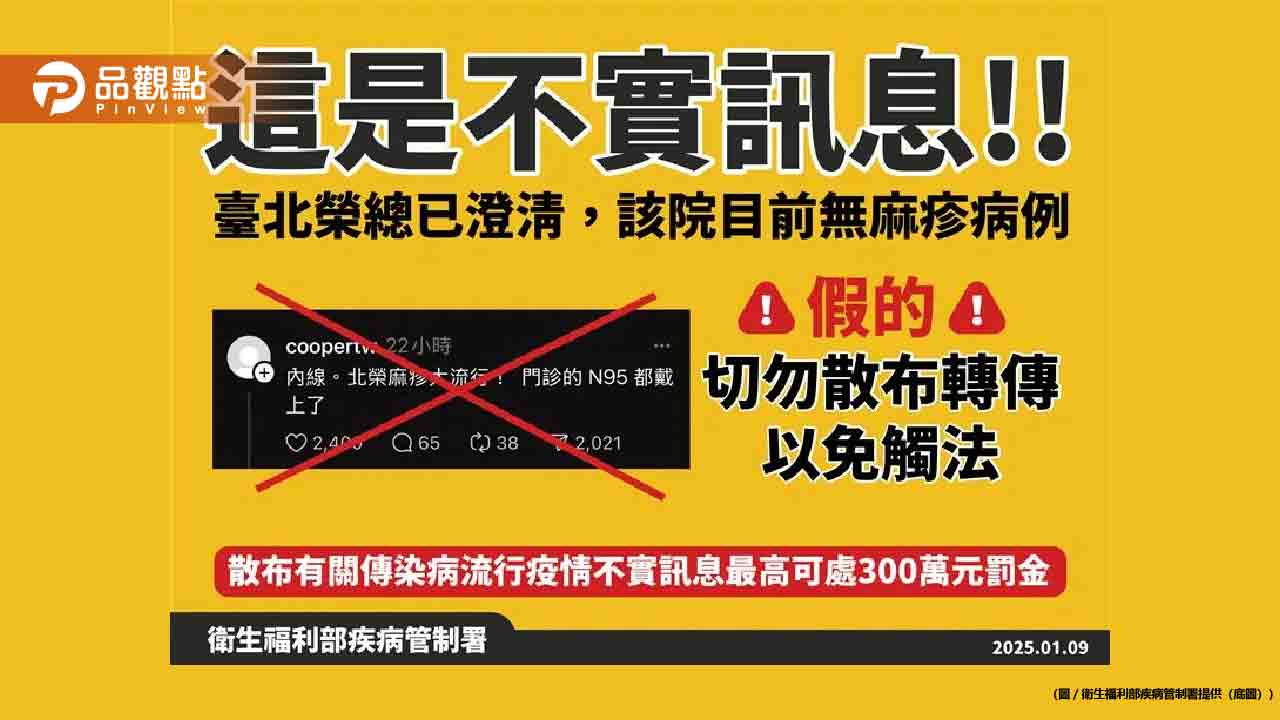 近期在網路上流傳「北榮麻疹大流行,門診N95口罩全戴上」等不實訊息,引起民眾恐慌,甚至出現搶打麻疹疫苗的情況。對此,台北榮民總醫院出面澄清,強調院內目前並無麻疹病例,醫院感染管制中心正密切監控疫情,維持高度警覺,並採取必要的防範措施。急診檢傷區也針對發燒及紅疹病患,進行詳細的旅遊史、職業別、接觸史及群聚情形詢問,以確保即時掌握疫情動態。