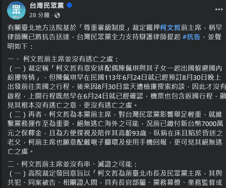 有關臺北地方法院基於「尊重審級制度」裁定羈押柯文哲前主席,稍早律師團已將抗告送達,台灣民眾黨全力支持辯護律師提起抗告,並聲明如下:
