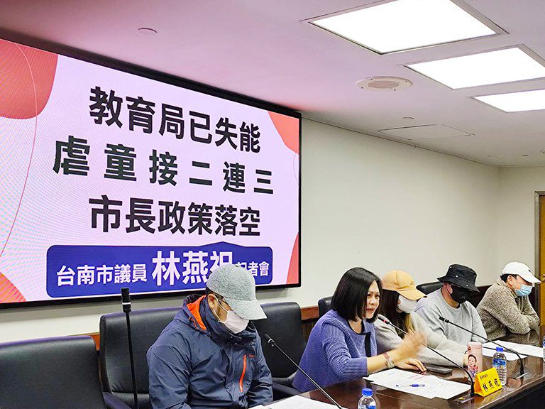 台南市國民黨議員林燕祝,接受歸仁區家長集體陳情,今天召開『教育局已失能、虐童接二連三、市長政策落空』記者會,林燕祝指出,一班26位小朋友,18位幼兒被虐待,家長們想看錄影帶仍被推三阻四,看到帶子中,老師好像格鬥選手,『巴頭』『打背』,幼兒已被打趴的痛苦倒地,老師還繼續打,家長們氣得立馬到派出所報案,分局要去調帶子卻發現硬碟毀損,全案已報請檢察官偵查。