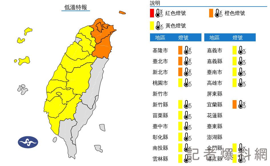 【橙色燈號(非常寒冷)】:新北市、基隆市、臺北市、宜蘭縣有持續10度左右或以下氣溫發生的機率,請注意防範。