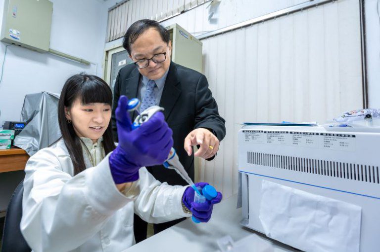 ▲國衛院生技藥研所所長謝興邦(右)指導博士生薛雯勻操作流式細胞儀。(圖/記者蔣彤雲攝)