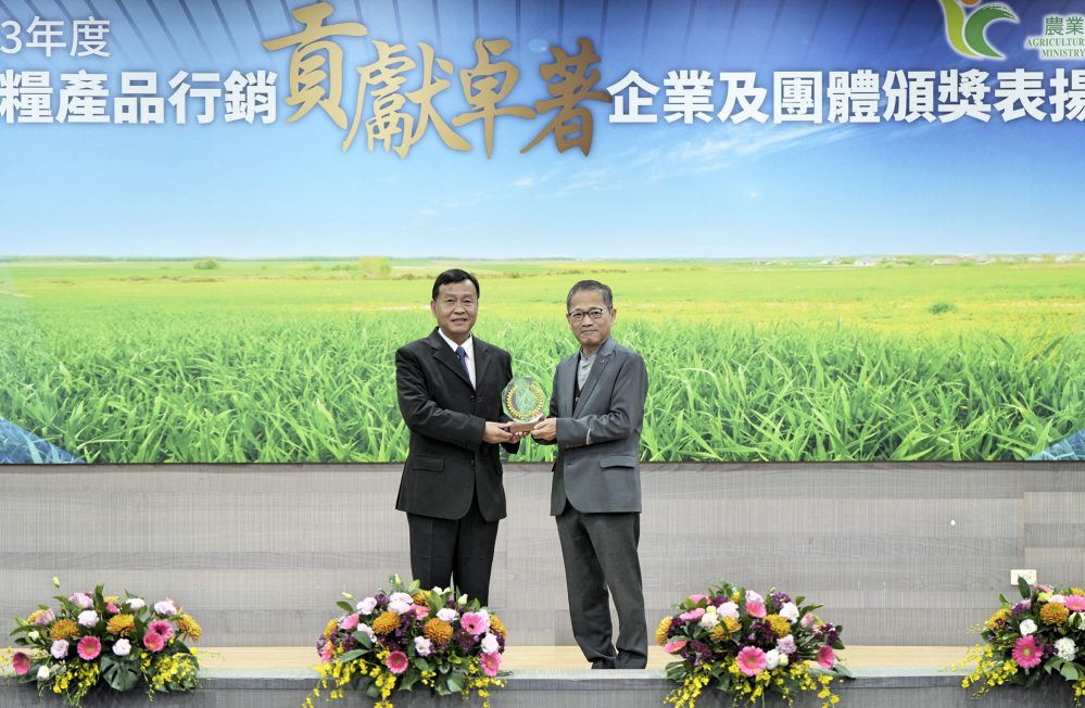 ▲農糧署署長姚士源(左)頒獎表揚企業,中衛發展中心董事長謝明達(右)代表中衛發展中心榮獲農糧署農糧產品行銷貢獻卓越企業獎。(圖/中衛發展中心提供)