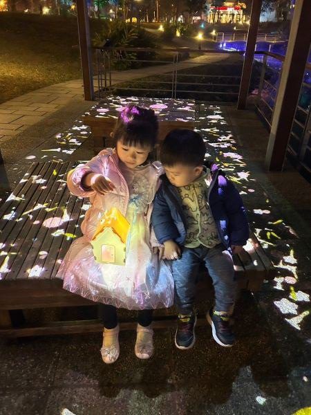 除了藝術家及團隊帶來的精采作品,東興圳光藝節的另一大特色是將新詩創作轉化為藝術裝置,邀請在地孩子漫步東興圳水岸,將最直接的感受轉化為二行詩,並以立體文字、螢光石、Gobo燈與鏡球、霓虹燈等素材,把詩句意境轉化為裝置藝術,漫步其間,詩意滿滿。