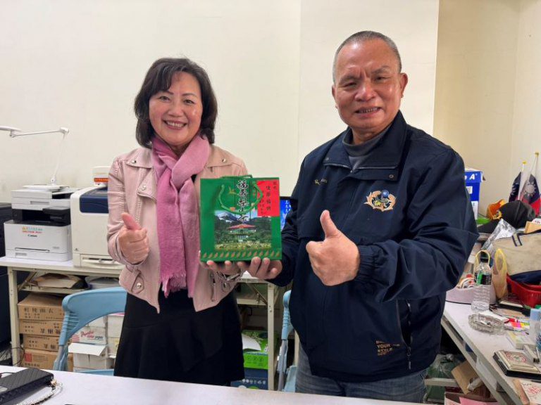 ▲白恩惠主任致贈廖成章里長新春賀禮感謝協助榮家各項事務。 (圖/記者蔣彤雲攝)