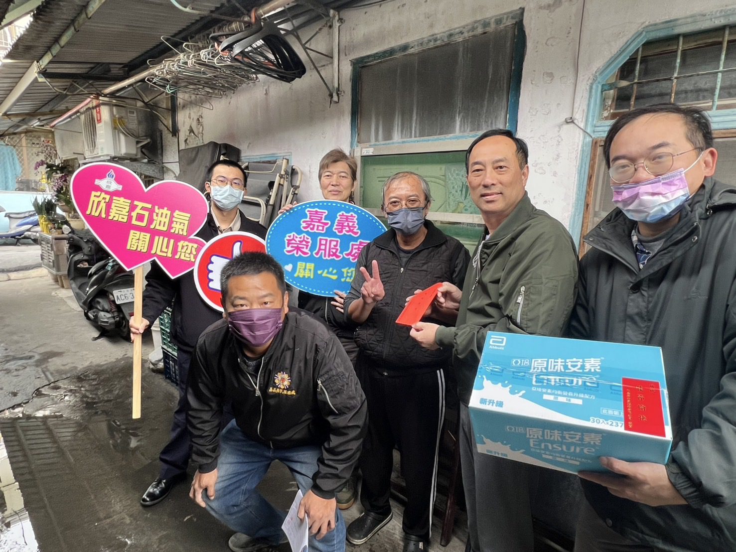 〔焦點時報/記者侯姵伃報導〕春節將近,16日榮服處許家豪總幹事陪同欣嘉石油氣公司黃金財董事長至認養之12戶弱勢榮民(眷)家中致贈安素營養品及慰問金每戶2千元,對於弱勢家庭的生活猶如及時雨,受助者皆表示相當感謝;嘉義榮民服務處為擴大對服務區內榮民眷照顧,與欣嘉石油氣公司定期簽訂「關懷獨居年長榮民(眷)服務照顧支援協定書」,由欣嘉公司針對周邊獨居年長榮民就近關懷訪視、電話問安、送餐、居家服務等,頗獲好評。