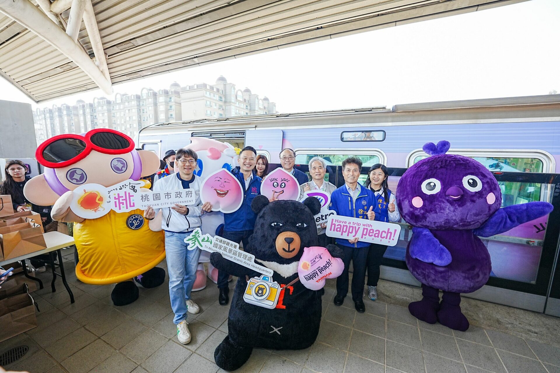 2025台灣燈會的亮點之一彩繪捷運「快樂桃子號」,今(20)日在桃園捷運A17領航站正式啟航,由桃園市副市長蘇俊賓與交通部觀光署署長周永暉共同揭幕。蘇俊賓表示,台灣燈會睽違九年再次回到桃園,此次以「快樂桃子號」串聯燈會展區,宛如全世界最大型的遊樂園列車,完美融合桃園的特色元素水蜜桃以及燈會歡樂的氛圍,成為燈會的一部份,這也將是今(114)年台灣燈會最具特色的亮點之一。