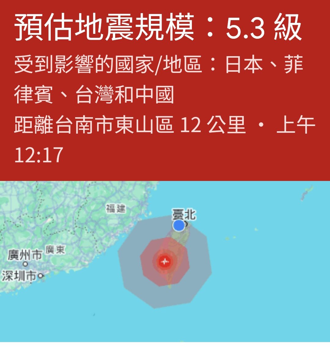 據中央氣象署資料顯示,預估震度3級以上地區:新竹、苗栗、台中、南投、彰化、雲林、嘉義、台南、高雄、屏東、宜蘭、花蓮、台東、澎湖。