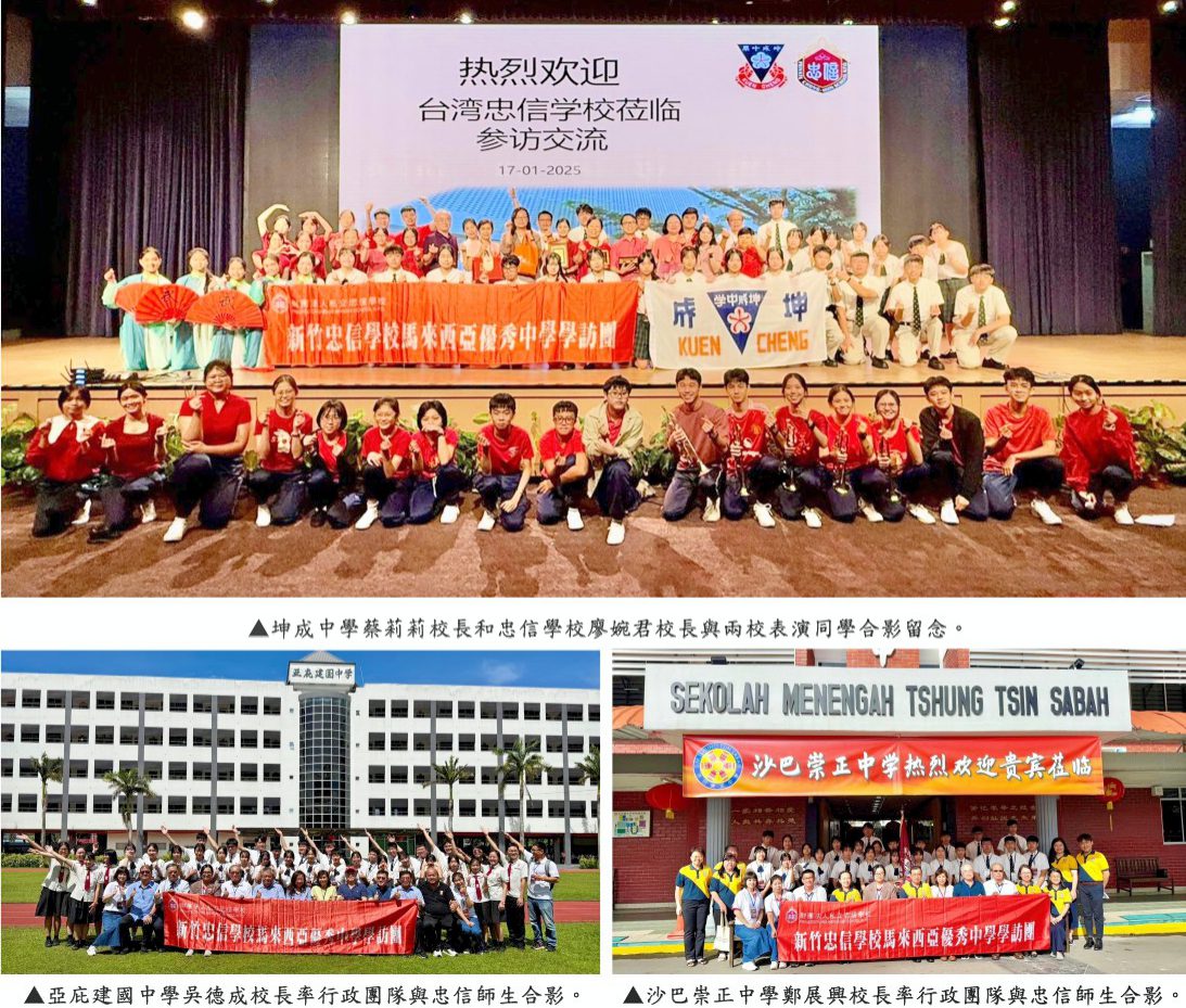 【焦點時報/記者羅蔚舟報導】為充實及培育「南向」人才,促進並擴大文化及人才雙向交流,新竹「忠信學校優秀學生馬來西亞學訪團」師生,在忠信文教基金會董事會代表/原清華大學附屬小學溫儀詩校長的帶領下,於2025年1月12日起,與馬來西亞三所忠信姐妹學校做了為期一週的交流,受到熱烈歡迎。三所學校分別是,「東馬」沙巴邦的建國中學和崇正中學,以及「西馬」的吉隆坡坤成中學。