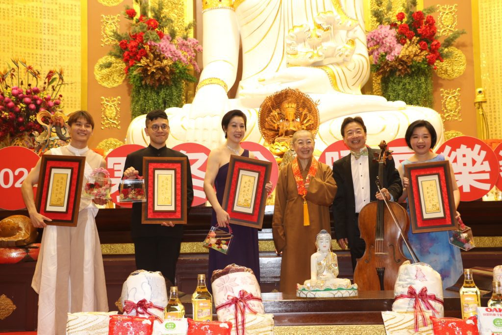 覺培法師感謝大提琴家張正傑11年來的情義相挺++右起鋼琴家廖皎含、張正傑、覺培法師、次女高音翁若珮、男高音林義偉及大環老師楊世豪。(圖/金光明寺)