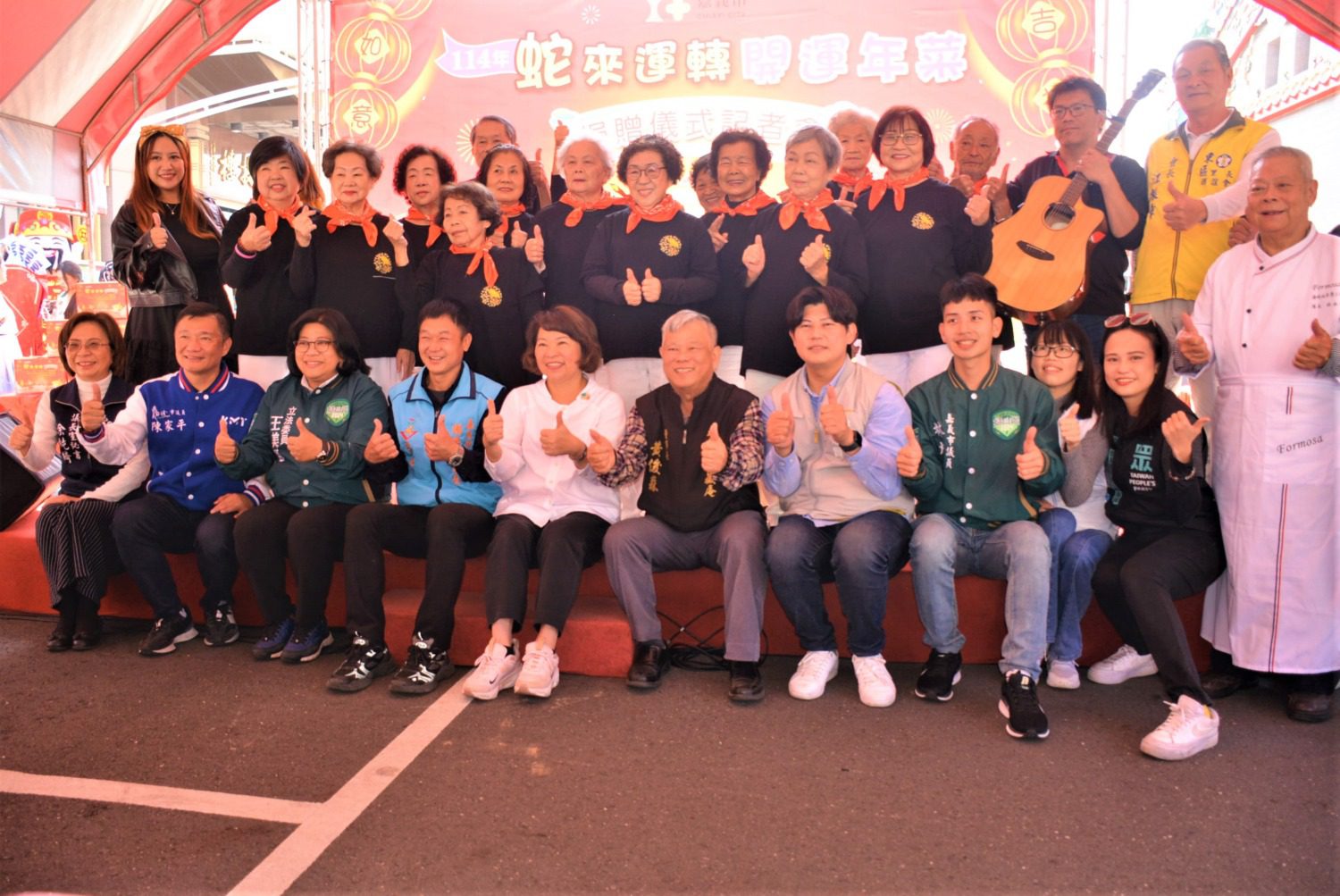 今日年菜捐贈、發送活動中有別出心裁的「年菜上菜秀」,邀請東吳高級工業家事職業學校餐飲管理科的學生擔任表演年菜上菜秀,由學生於活動記者會上展示市府精心準備的美味佳餚年菜;今年的年菜分別是全雞的雞鳴報福、蘿蔔糕好彩頭、鮮魚的魚躍龍升、臘肉的香臘迎春、步步高升的蛋糕、飽滿珍榖的白米、大悲水以及另外加碼的1,000元開運年菜金,期許大家在蛇年能蛇麼好運攏總來,心想事成。