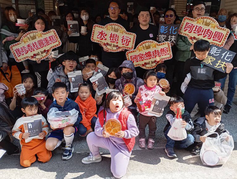 ▲這次活動來自彰化市、花壇鄉、和美鎮及鹿港鎮共計四鄉鎮100名家扶親子,每戶家庭可獲得的物資相當豐富,有阿泉爌肉飯2碗、老担阿璋肉圓2碗、水根行肉乾1包、寶珍香十兩大餅1盒。(圖╱記者孔亮云攝)