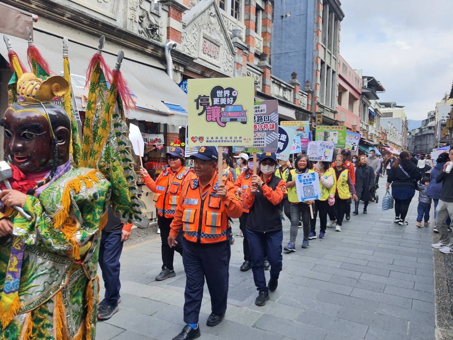 現場有義交民力及婦女志工團體配合於大溪老街遊街結合本地社頭支援展示神將、僮仔,吸引許多民眾注意圍觀,達到交通安全宣導效果;另同時宣傳大溪分局春節連續假期期間相關交通疏導措施,以提供用路人最新交通訊息,有效利用替代道路,確保交通順暢。現場擺設市面盛行熱潮的夾娃娃機內置各式交通宣導品及宣導傳單,設計關卡考詢交通相關常識,答對即可獲得一次夾娃娃機會,以寓教於樂方式,藉以達到宣導目的。