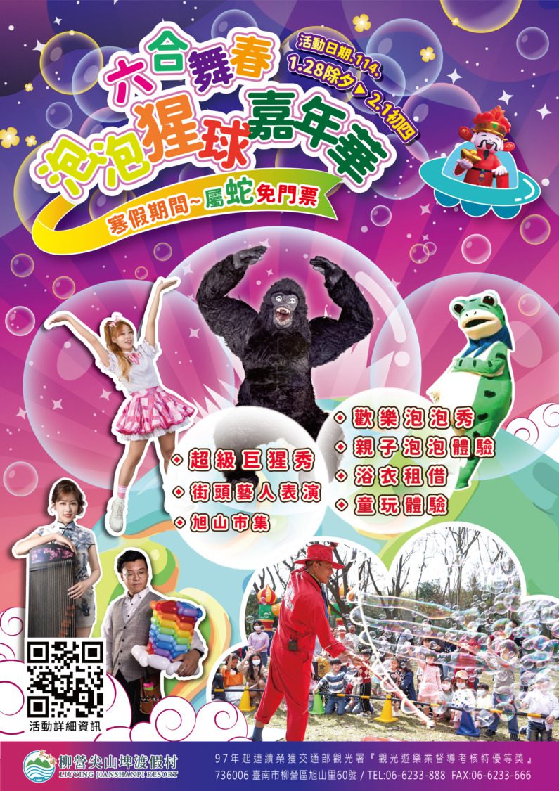 【今傳媒/記者張淑慧 報導】為迎接寒假及農曆新年,台糖尖山埤渡假村推出一系列精彩活動與優惠!即日起至2月10日,生肖屬「蛇」的民眾可憑證免費入園。此外,春節期間(1月28日至2月1日)限定舉辦的「泡泡猩球嘉年華」,將帶來滿滿歡樂,包括小朋友最愛的「歡樂泡泡秀」、由大金剛玩偶熱舞助陣的「超級巨猩秀」、旭山特色市集及街頭藝人展演等活動,邀請全家大小共襄盛舉。大家可以賞百花、遊湖景、看表演、品美食,共度佳節,迎接2025金蛇年的到來。