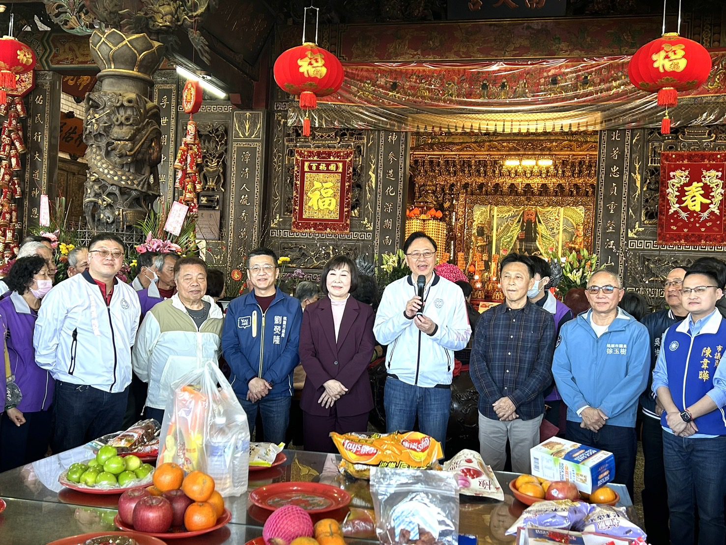 桃園市長張善政今(30)日先後前往桃園護國宮、八德閩臺宮、龍山寺、大溪仁和宮、普濟堂、龍潭南天宮、龍元宮、平鎮福林宮及褒忠祠等9間宮廟參香祈福。張市長表示,大年初二適逢天氣晴朗,許多信眾齊聚廟宇參香祈福,展現虔誠信仰。張市長也攜同夫人及市府團隊向市民朋友拜年,誠摯祝福市民在新的一年身體健康、闔家平安。