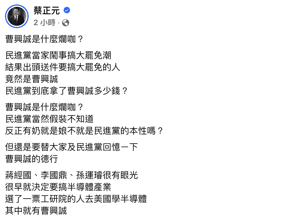 前國民黨立委蔡正元今(3) 日在臉書發文,猛烈抨擊半導體業者曹興誠的政治立場轉變。蔡正元以「爛咖」形容曹興誠,並詳述其從早期獲政府栽培到今日力挺民進黨的爭議過程,引發網友熱烈討論。
