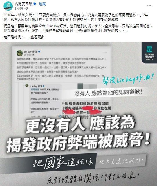 近日的進口雞蛋爭議中,農業粉專“Lin bay好油”版主、農產專家林裕紘揭露許多的內幕和相關資訊,他22日透露遭到恐嚇,為了家人安全,決定停更臉書粉專,也不再上節目。民眾黨表示,從什麼開始,我們已活在“綠色恐怖”的年代,並指連民進黨2024大選參選人賴清德都曾在2020黨人初選時求饒,事隔四年換成自己競選2024大選,網軍出征抹黑的惡質文化,卻變本加厲。