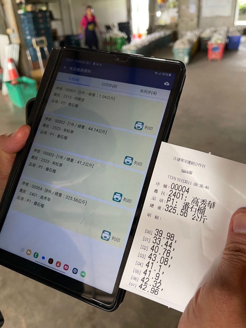 杉林區金恩典農場朱映帆導入電動自走式搬運車,以往4公頃荔枝施肥需10個人花2天才能完成,現在只要1個人操作1天即可完成,省下大量人力與時間成本,燕巢區吉建果菜運銷合作社也導入智慧磅秤系統,以往番石榴重量紀錄皆由人力一筆一筆記錄在紙箱上,常因手寫造成誤差,資料的保存與檢視也相當不便,現由智慧磅秤秤重完後直接列印並記錄到電腦,不僅清晰易讀,資料也都存在電腦中方便日後查閱。