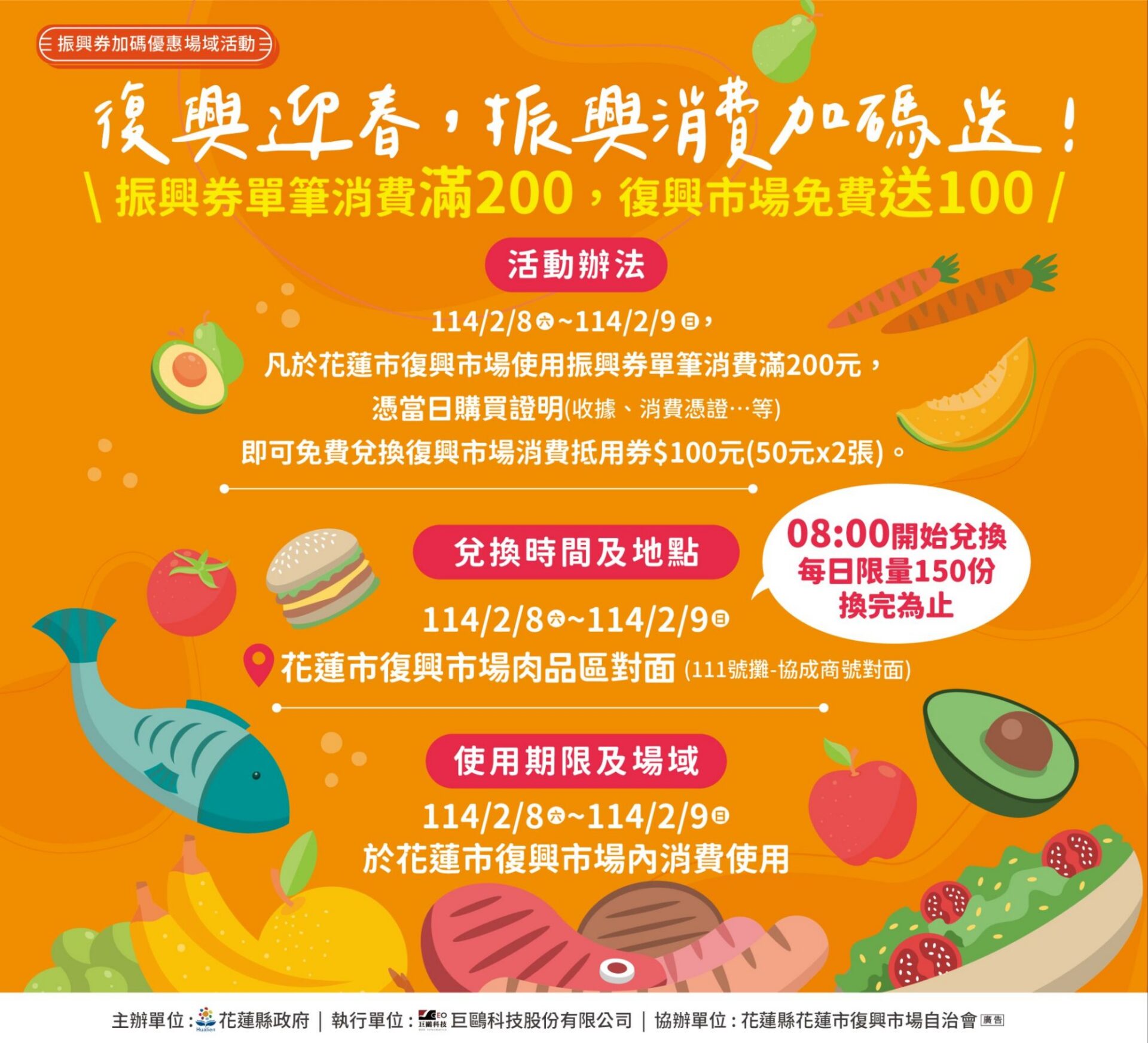 「復興迎春.振興消費加碼送!」活動將於114年2月8日(六)至114年2月9日(日)限時兩天舉行。活動期間內,凡使用花蓮振興券於花蓮市復興市場單筆消費滿200元,憑當日購買證明就可以免費兌換復興市場消費抵用券100元,兌換時間自上午08:00開始,每日限量150份,數量有限,換完為止。