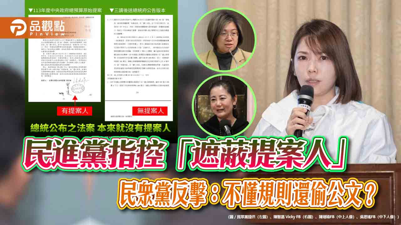 民進黨日前指稱,在總預算案審查報告中,原本有提案人的地方被「刻意遮蔽」,質疑立法院是否在替國民黨與民眾黨「掩飾」角色。對此,台灣民眾黨團主任陳智菡出示相關文件,強調:「所有黨團或立委的預算提案,一旦經過院會『三讀通過』,即成為立法院的共同決議,而不再是個別委員的提案,因此總統公布的法案版本自然不會再列上提案人。」