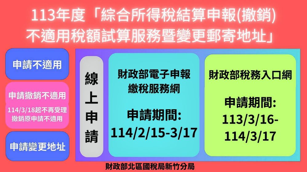 財政部北區國稅局新竹分局進一步表示,前揭申請項目可於申請期限內上班時間,就近至各地區國稅局分局、稽徵所及服務處臨櫃提出申請,但第2項「欲自113年度起撤銷原申請不適用稅額試算服務」者,僅可向戶籍所在地國稅局申請,相關服務亦可至財政部電子申報繳稅服務網站(網址: https://tax.nat.gov.tw )線上申請。