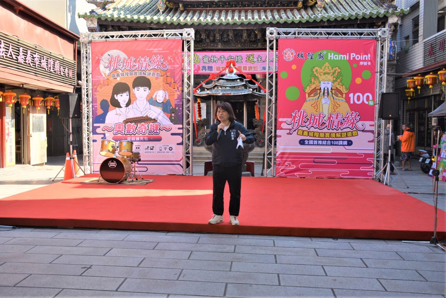 嘉義市長黃敏惠表示,嘉義市城隍廟是嘉義市的重要信仰中心,不僅承載著悠久的歷史,更像是一座充滿文化內涵的博物館,繼2023年推出第一代「桃城情緣」限量實體遊戲包後,獲得不錯的回響,今年更是結合數位科技讓玩家只需透過手機,就能解開重重謎團,深入了解廟宇故事與歷史,不僅提升遊戲的可玩性,同時也減少紙張與資源浪費,讓遊戲體驗更加永續環保;此外,這次推出的實境解謎遊戲,不只是介紹城隍廟的歷史,最大的特色亮點之一是與108課綱接軌,內容經大業實中老師轉譯與編輯,遊戲謎題設計融入國中七至八年級國文、英文、數學、歷史、自然等學科內容,創造出讓人耳目一新的遊戲及學習體驗。