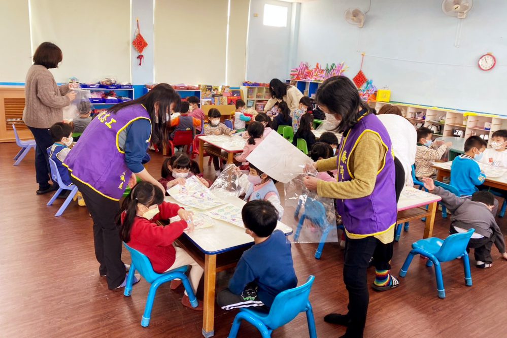 ▲竹市政風處「AI科技點亮廉潔之光巡迴宣導活動」到加米幼兒園,廉政志工教導幼童製作竹市蛇年燈籠。(圖/竹市府提供)