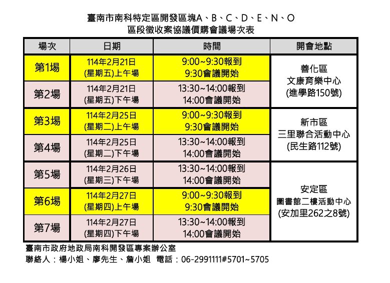 臺南市政府訂於114年2月21日、2月25~27日辦理7場南科特定區ABCDENO區段徵收案協議價購會議