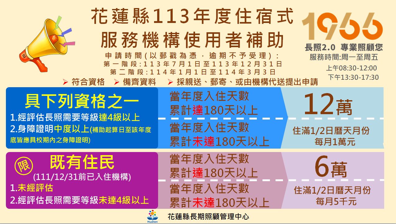 朱局長溫馨提醒,第二階段申請時間為114年1月1日至3月3日止,符合申請資格者,逕向113年底前最近一次入住機構提出申請,民眾如欲了解住宿式機構使用者補助方案相關訊息或有申請需求者,請至花蓮縣長期照顧管理中心網站或花蓮縣政府社會處網站查詢,此外,凡實際居住本縣且有長照服務需求的民眾,可電洽長照專線1966,將有專人服務。
