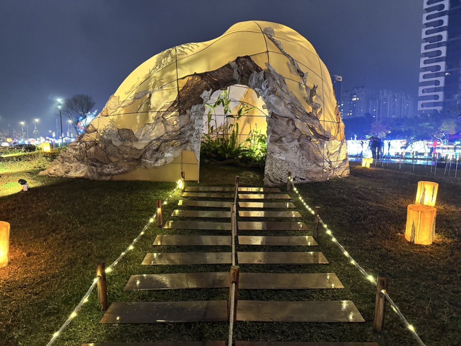 環保局說明,在展區中處處可見低碳及創意作為,例如燈組材料採用可回收材質,使用樹皮、環保永續材質的布料為主,使其可分解及可回收。在大會服務台、流動廁所間,也裝設LED節能燈具,不僅具巧思也能節省用電;此外,佈展材料也呼應循環經濟,如展間室內外展牆使用可回收的農用啞管搭建,活動結束後回收給農民使用,減少廢材的產生,透過優先使用可重複回收材質,不僅降低資源消耗,也讓燈會場域更簡潔、美觀。