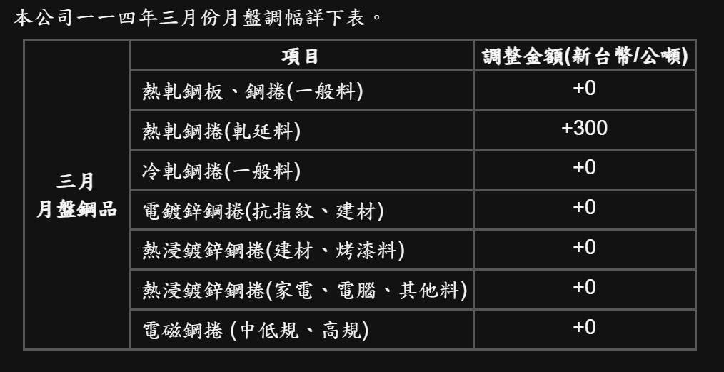 中鋼公司一一四年三月份月盤調幅呵呵表