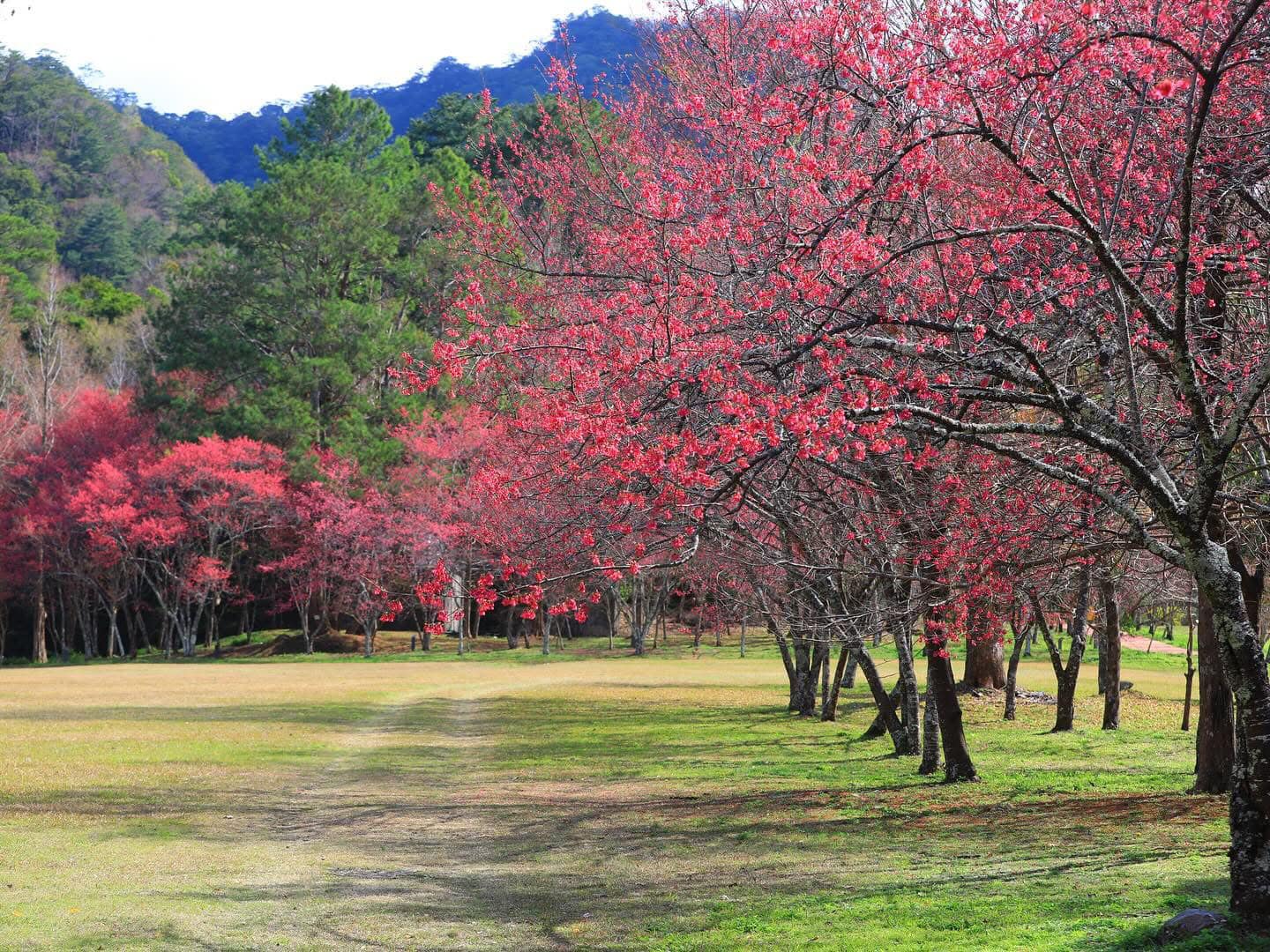 ▲奧萬大森林遊樂區內栽滿上千株櫻花樹,大草坪上的緋寒櫻正開放。(圖/林業保育署南投分署提供)